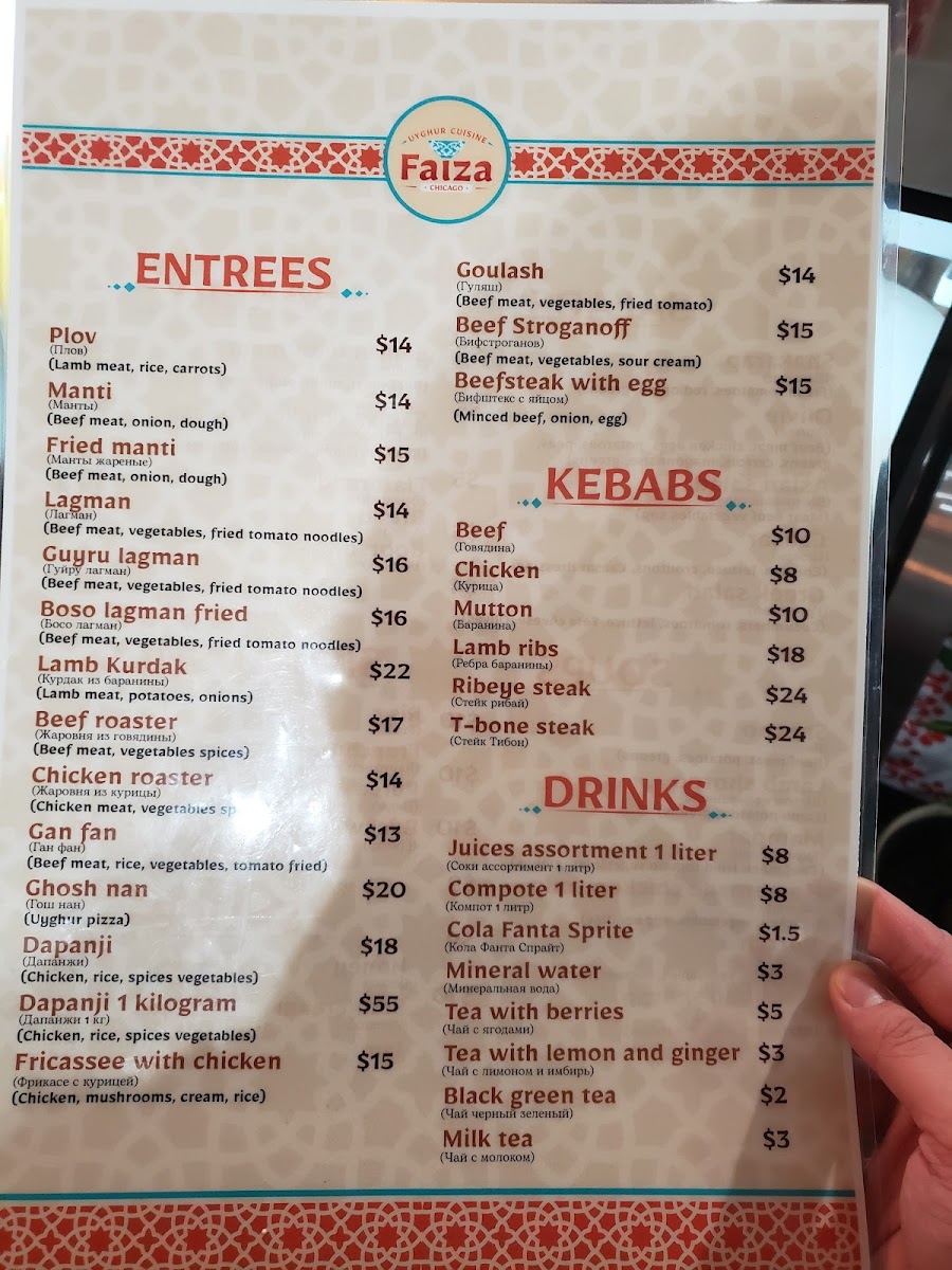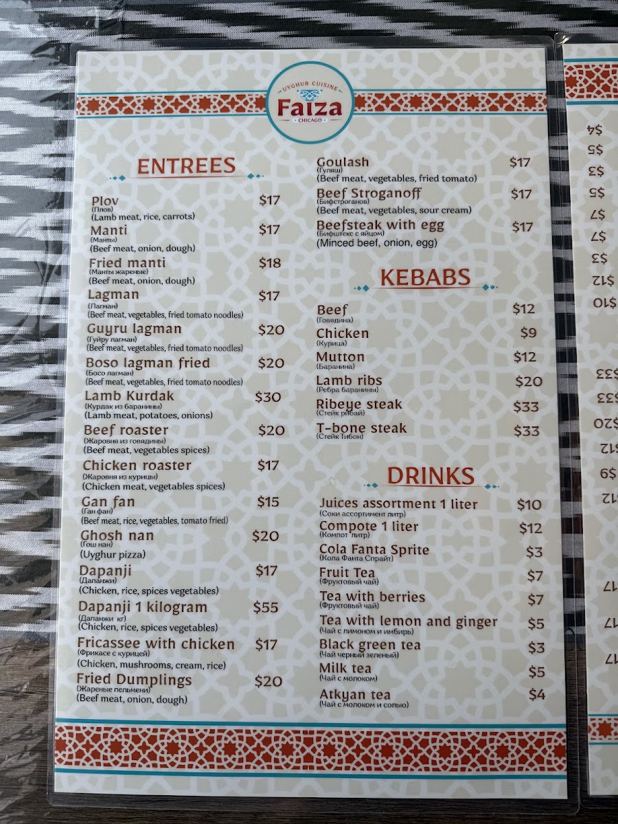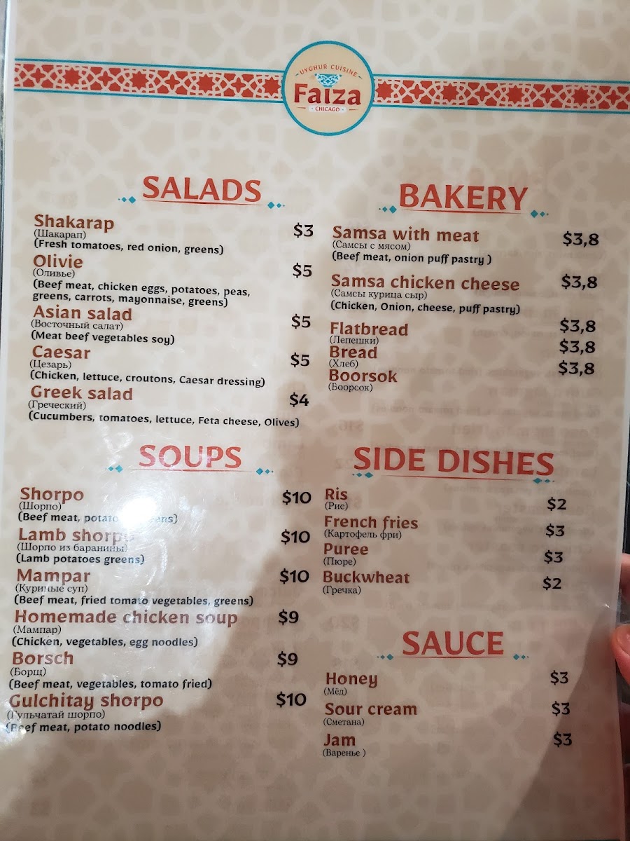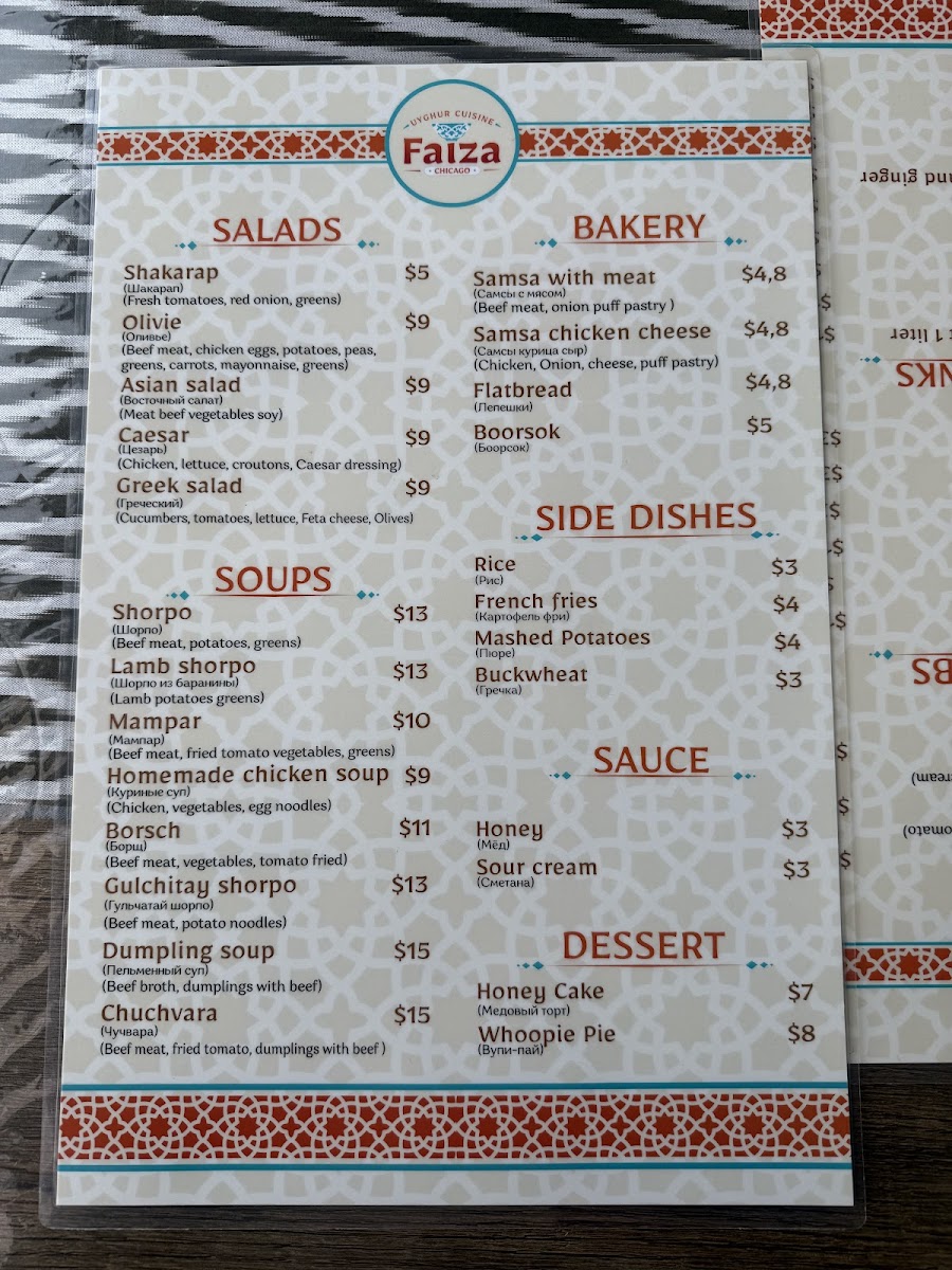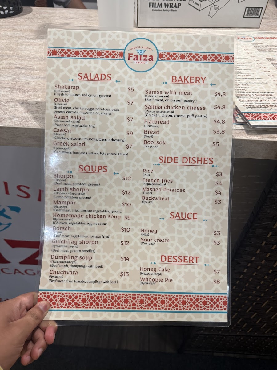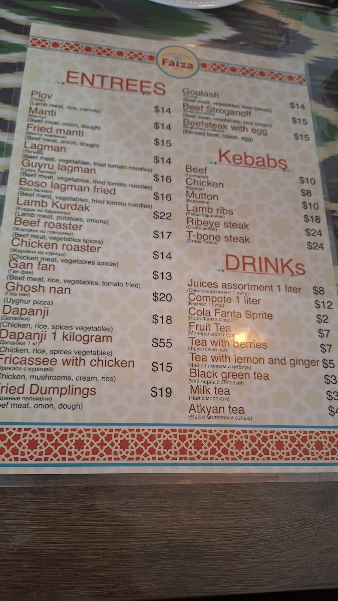 Welcome to Faiza Chicago, where every dish is a celebration of flavors that will take your taste buds on a delightful journey. Nestled at 3315 W Bryn Mawr Ave, this restaurant is a must-visit for anyone craving authentic cuisine. Begin your culinary adventure with our mouthwatering Plov or indulge in the delicate richness of our steamed dumplings. Don't miss out on our sweet Honey Cake, the perfect companion to your meal. Savor the robust flavor of our Fried Tomato Noodles or dive into a classic Beef Stroganoff. For something heartier, try our Buldak Lamb Rogan Josh or the savory Жаровня Из Говядины. And let's not forget our refreshing Фруктовый Чай to cleanse your palate. Join us at Faiza Chicago and discover why our menu is a feast for the senses!